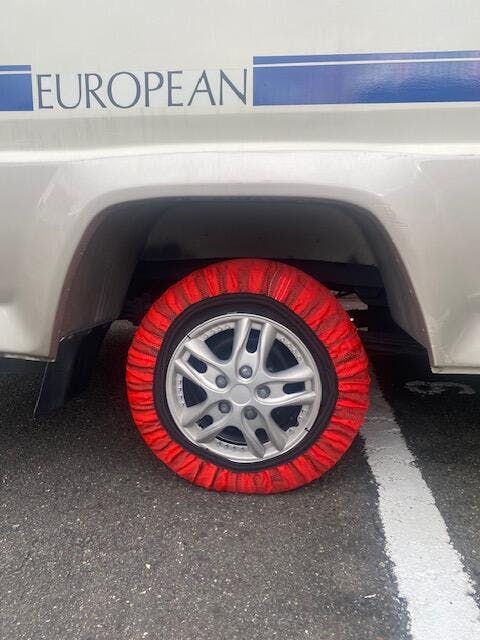 イッセ・スノーソックスの使用方法はとても簡単です。タイヤにカバーのように被せていきます。 タイヤ半分に被せ終わったら、クルマを少し移動させ、残りの半分にもしっかりと被せます。