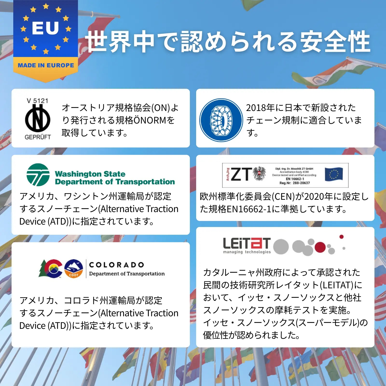イッセ・スノーソックスは、国土交通省が定める「チェーン規制適合品」として認定されており、冬期における降雪時や凍結路面でのチェーン装着が義務づけられる区間でも安心してご使用いただけます。