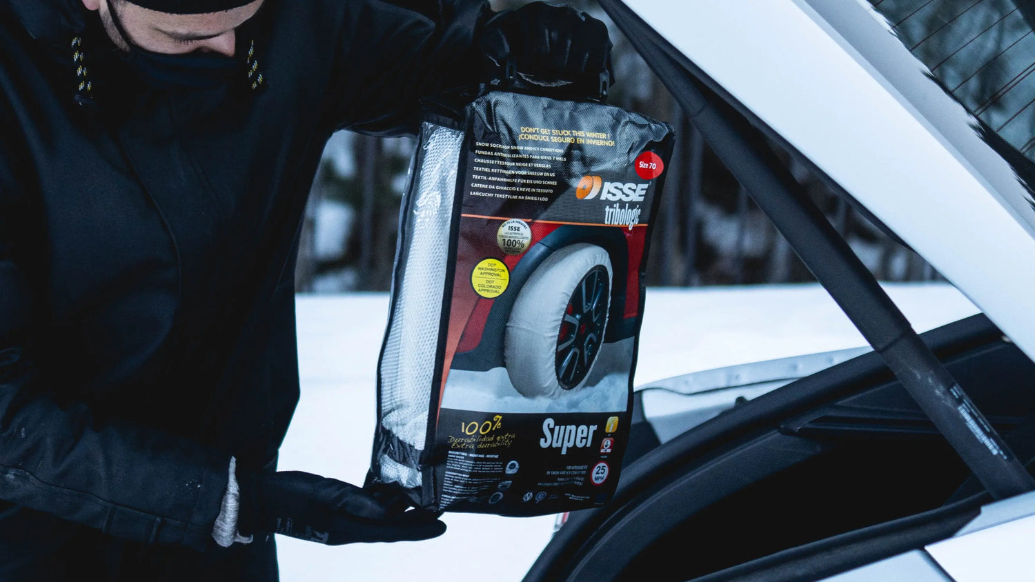 イッセの布製タイヤチェーンはタイヤに"かぶせるだけ"だから初心者でも安心。たったの3分で装着できます。