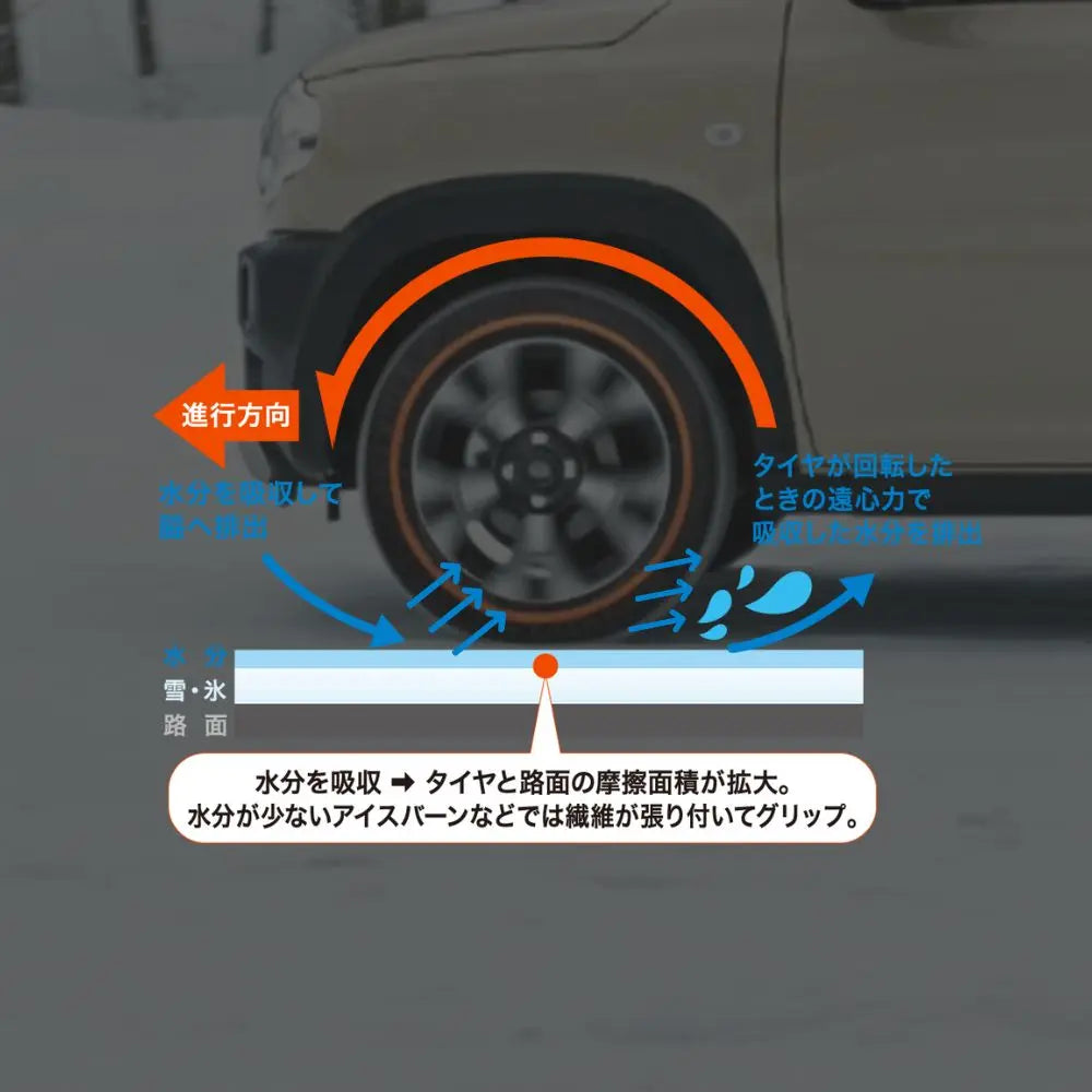 通常、タイヤが雪に接すると雪が溶けて水が発生します。この水分がスリップの原因となります。イッセ・スノーソックスの強靭で立体的に編み込まれた厚い布が水分をしっかりと吸収し、タイヤが回転する遠心力で水分をする排出することで、タイヤと路面の摩擦面積を広げてグリップ力を高めます。水分の多い日本の雪道やシャーベット状になりやすい都心の路面でも安心して走行できるのはこのためです。